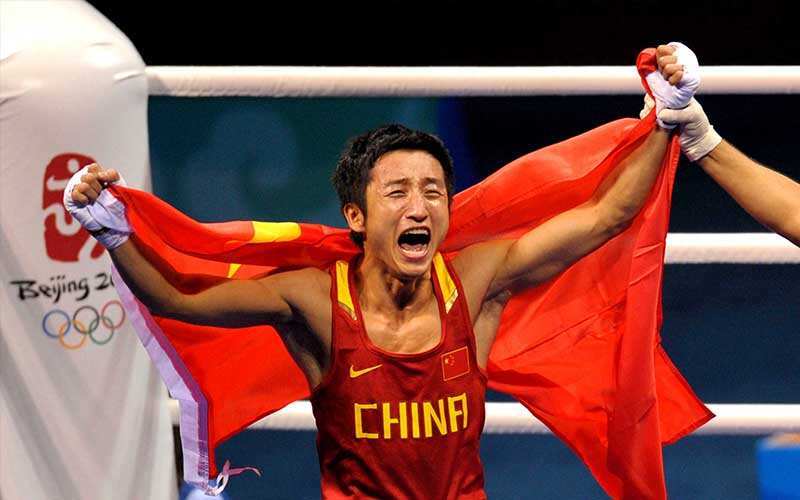 邹市明在泰山拳击台上为中国队获得奥运史上第一枚拳击金牌